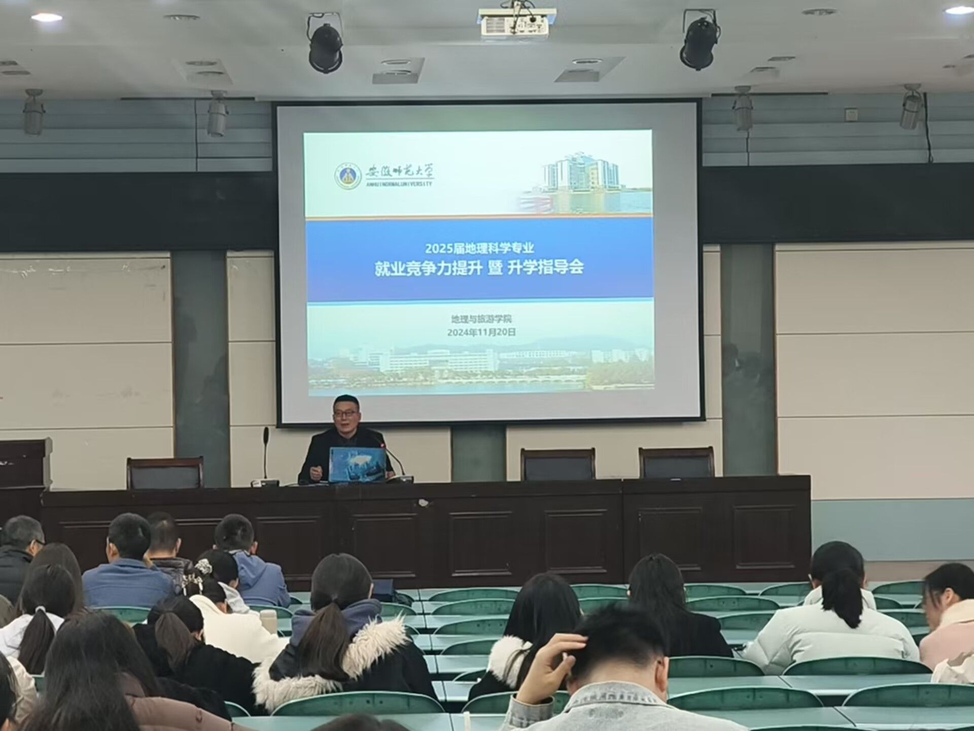 周润/何铵楠)11月20日下午,地理科学(师范)专业在实验楼101召开2025届就业竞争力提升暨升学指导会。会议由专业负责人朱永恒主持,专业教师代表为同学们做考研指导,2021级地理科学专业全体毕业生参加会议。