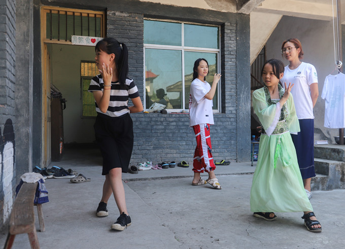 汉语言文学专业大二的学生,学习舞蹈已经有3年的时间了,舞蹈并非她的专业,但练习古典舞一直是她情有独钟的事。“我这次赴川支教,最大的愿望不光是能教她们学会舞蹈,还很希望融入一些中国元素在日常教学里面,想让他们多了解一下祖国的传统文化。”。知道今天要学古典舞,孩子们都表现的有些兴奋,其中8岁的唐思佳还专门换上了汉服,曲裾轻舞炎黄魂,绿色的裙摆随着舞姿的变化轻轻摆动,在阳光下显得尤为好看。下课铃声响起时,孩子们显得有些不舍,“再练一会,再练一会吧。”孩子们拉着老师的衣角,央求老师多教一点新动作。“你们为什么那么喜欢古典舞啊?”曲心彤被孩子们围在中间,笑着问她们“因为老师跳的好看!”“像花仙子!”孩子们一下子笑开了。“看到她们那么喜欢古典舞,我真的很满足,虽然她们年龄很小,也许领悟不到古典舞里蕴含的中国文化,但我想给她们多一点启蒙。”曲昕彤说这句话的时候眼睛里透着满满的坚定。