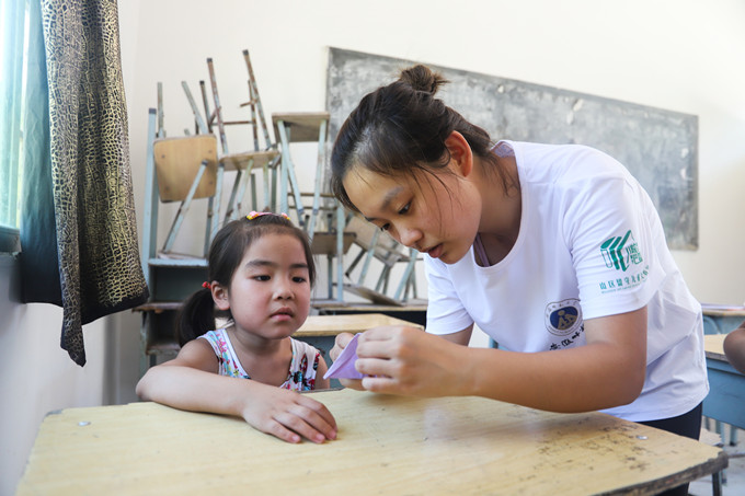 “姐姐,这个千纸鹤送给你。”张月来到老师办公室里害羞地递给志愿者田倩刚叠好的手工作品。田倩是负责教授手工课的老师。“我们把这张纸对折,然后折叠过来……”手工课的课堂里不时传来孩子的欢笑声和剪刀的咔嚓声,“孩子们学习手工的热情很高,有些小一点的孩子学得慢,大一点的孩子就会停下来教她们,大家在一起折千纸鹤,折花朵,跟孩子们呆一起久了,我也变得有想象力了起来。”在志愿者老师的带动下,手工已经成为孩子们休闲娱乐的一部分。“老师,再给我一张彩纸好吗”“我也要!我也要!”下课过后,办公室门口总是围着一群要彩纸的孩子们。叠蝴蝶,叠喇叭花,对孩子们来说已经毫不费力了。“有些孩子现在折得比我都好了。”田倩笑着说“我得赶紧学一点新的内容,争取多教他们一点新花样。”令队员们感动的是,孩子们每学会一点新花样,就会立刻把自己最满意的作品送给志愿者们。“我是第一个收到孩子礼物的人。”志愿者刘新宇骄傲的说,指着自己桌上满满的小礼物,“你看,办公室里这些纸质花,小蝴蝶,都是孩子们送来的,孩子们很善良很单纯,我们对他的好他都记得。”