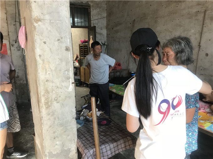 正值七月酷暑天,队员们结伴走在唐寨镇的乡间小路上,繁忙的行程也依然不能阻挡队员们对扶贫公益工作的热情。到达村民臧爷爷家里的时候,队员们停下彼此之间的交谈,安静地走到略微破旧潮湿的房间门口,臧爷爷的妻子从房间里走出来热情地招待队员,把队员们的手拉到自己手里亲密交谈,提及家里状况的时候,老人的脸上露出一丝丝的无奈。儿子的病给本来正常的生活带来许多重担,而臧爷爷夫妻二人都年近半百,好多农活已无法承担,生活过得尤为艰苦。当队员向老人提起团队的扶贫活动的时候,老人表示十分支持并希望得到帮助。