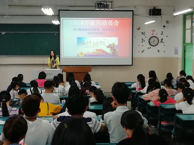 本网讯(尹琦蕾 彭媛媛)2018年五月四日,在五四青年节这个特殊的日子里,地理信息科学及城乡规划专业在行知楼2040302教室召开“大学生征兵入伍动员暨退伍士兵交流会”主题班会,会议由辅导员彭媛媛主持。
