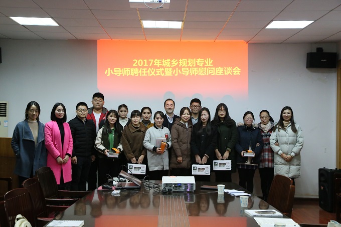 举办了2017年城乡规划专业小导师聘任仪式暨慰问座谈会。国旅学院党委副书记乔静、城乡规划专业教师代表、各班级辅导员参加聘任仪式及慰问座谈会,会议由辅导员彭媛媛主持。