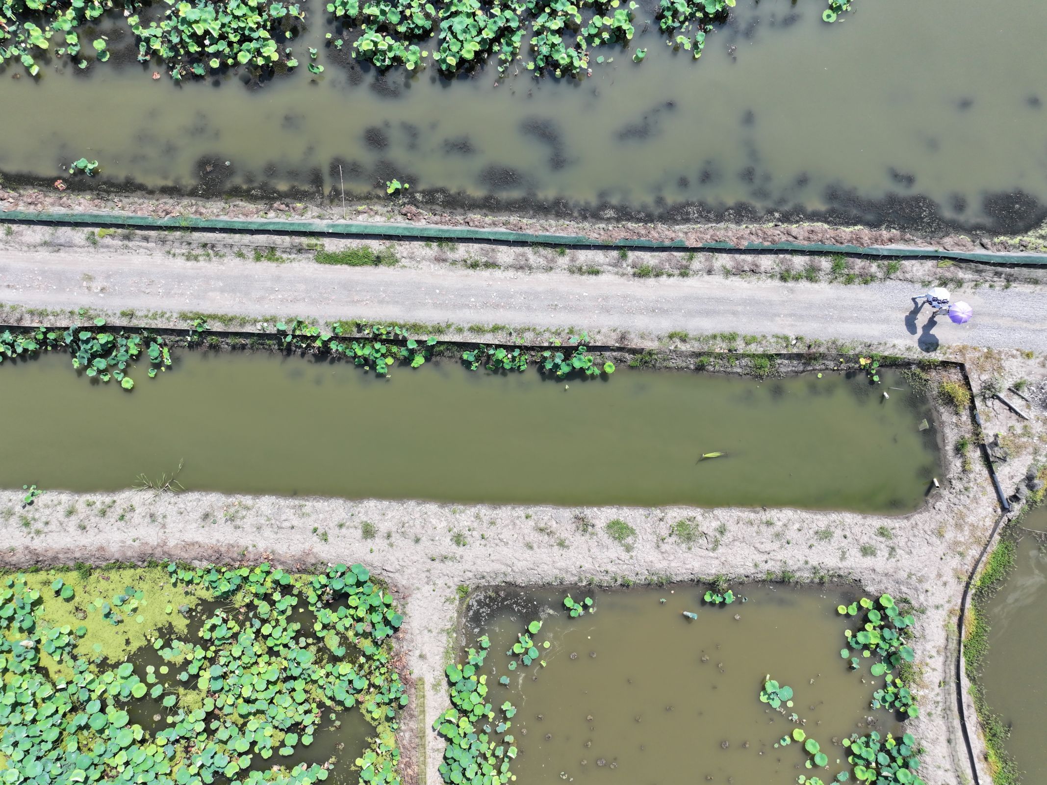 7月4日,团队再次前往7月2日采样点处,运用无人机对池塘进行全方位观测,并详细记录池塘特征信息。该池塘的“莲虾鱼共生”系统展现出显著的生态优势:莲花通过叶片遮阳稳定水温,为虾鱼提供适宜栖息环境;虾类排泄物经微生物分解后成为莲花养分;鱼类则摄食浮游生物和残饵,控制水体生态平衡,同时虾鱼共生形成饵料循环。这种协同作用构建起“莲护鱼虾、虾养莲鱼、鱼稳生态”的良性循环,提升了系统资源利用率与稳定性。