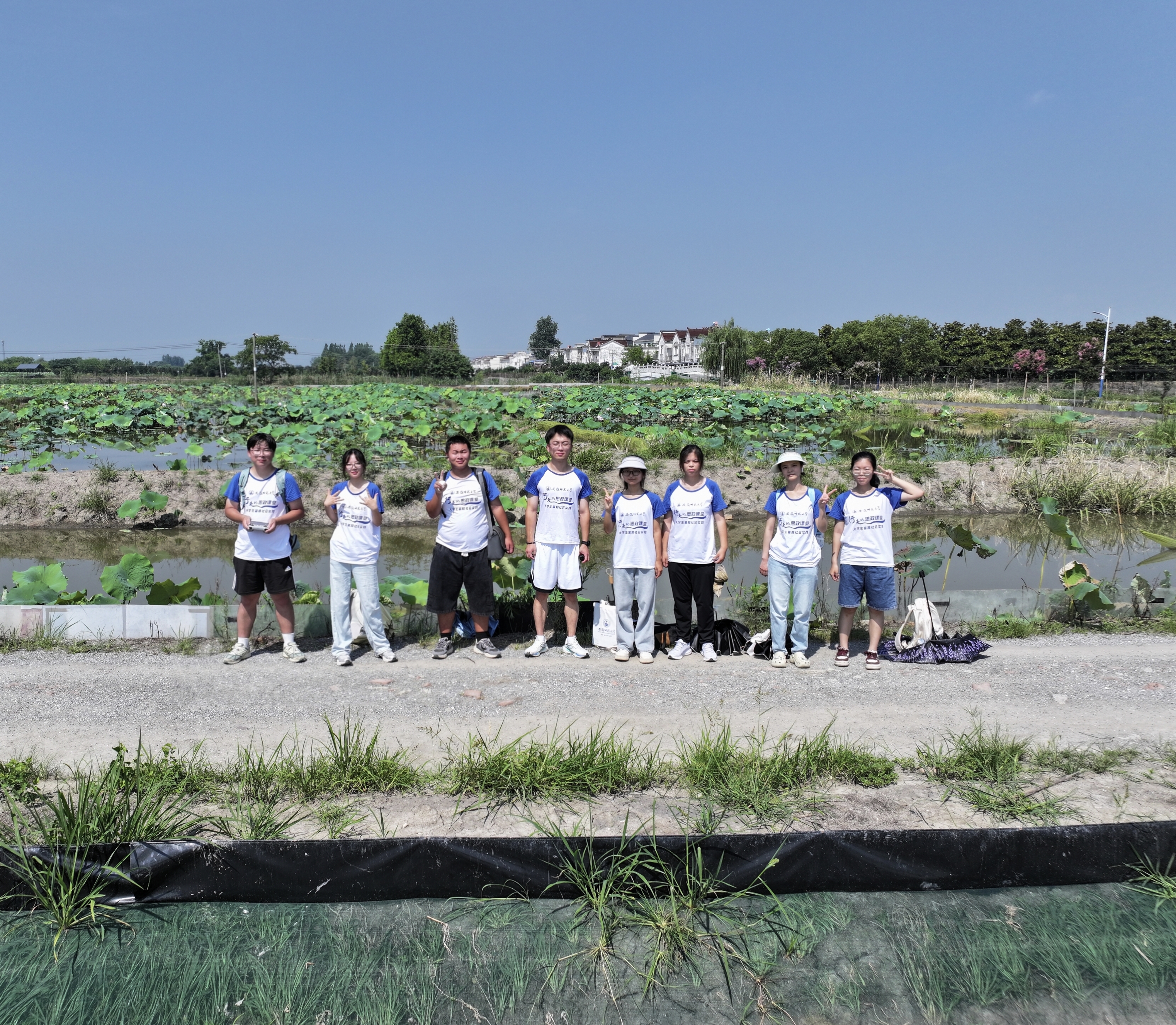 当天,团队还采访了附近饭店的经营者,其主要以鱼塘养殖为主,养殖周期为一年,通常在冬季播撒鱼苗,次年冬季收获。养殖过程中需定期投放饲料,以保障鱼类正常生长。通过对比分析,团队发现莲虾共生系统的能量利用率较高,但对水质的要求也更为严苛。调研结束返程前,团队成员在塘边合影留念。