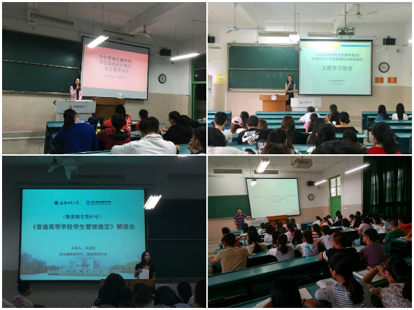 对于《普通高等学校学生管理规定》(教育部41号令)实施办法,并再三强调各辅导员要组织开展相关主题班会,普及到每一位学生,促使每位学生认识到位,学习到位,实践到位。9月以来,学院各年级辅导员先后召开《普通高等学校学生管理规定》(教育部41号令)主题班会10余场,并结合学生工作中的实际案例,告诫学生学习《普通高等学校学生管理规定》的重要性,促使学生树立主动学习、深入学习、强化学习的意识。