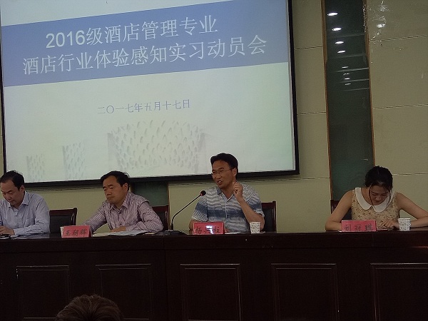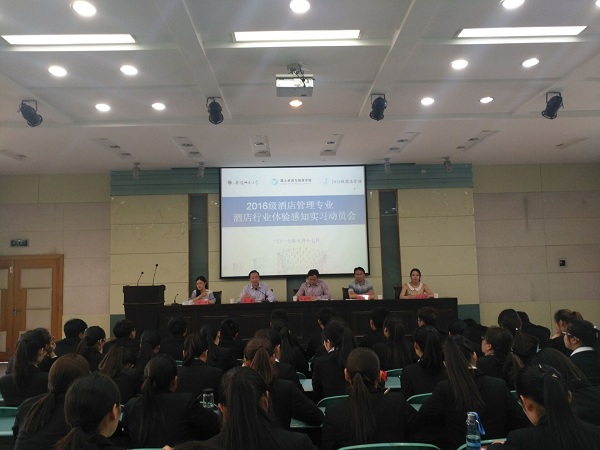 本网讯(国旅学院 刘冠琪、徐童彤)5月17日下午,,2016级酒店管理专业在院实验楼101召开酒店行业体验感知实习动员会。学院党委副书记乔静、副院长王朝辉、酒店管理专业负责人杨兴柱、实习指导老师洪娟、辅导员刘冠琪,2016级酒店管理专业全体同学参加了此次动员会。