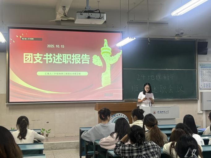 2024 级地理科学(师范)专业于四号楼2040103教室,召开班委换届班会。本次班会由地理科学(师范)专业全体同学共同参与,班助章怡晨主持,围绕前任班委述职、部分班委选举展开,既回顾了过去一年的成长与收获,也为班级未来发展注入新活力。