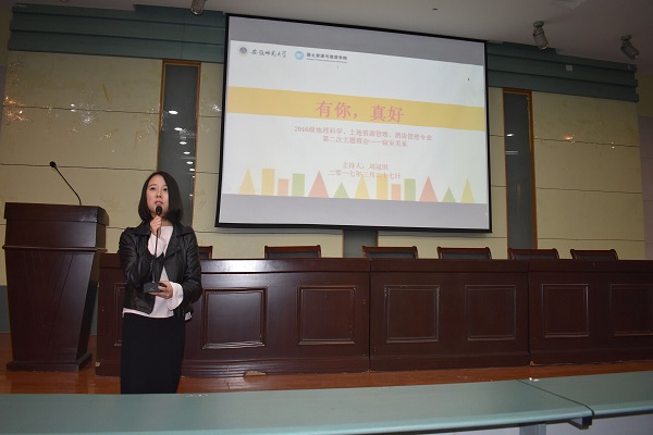 本网讯(2016级地理科学 黄灿)为了构建良好的寝室关系,形成融洽的寝室氛围,3月27日晚,国旅学院地理科学、土地资源管理和酒店管理专业在实验楼101教室召开了名为“有你,真好”的寝室关系为主题的班会。会议由辅导员刘冠琪主持。