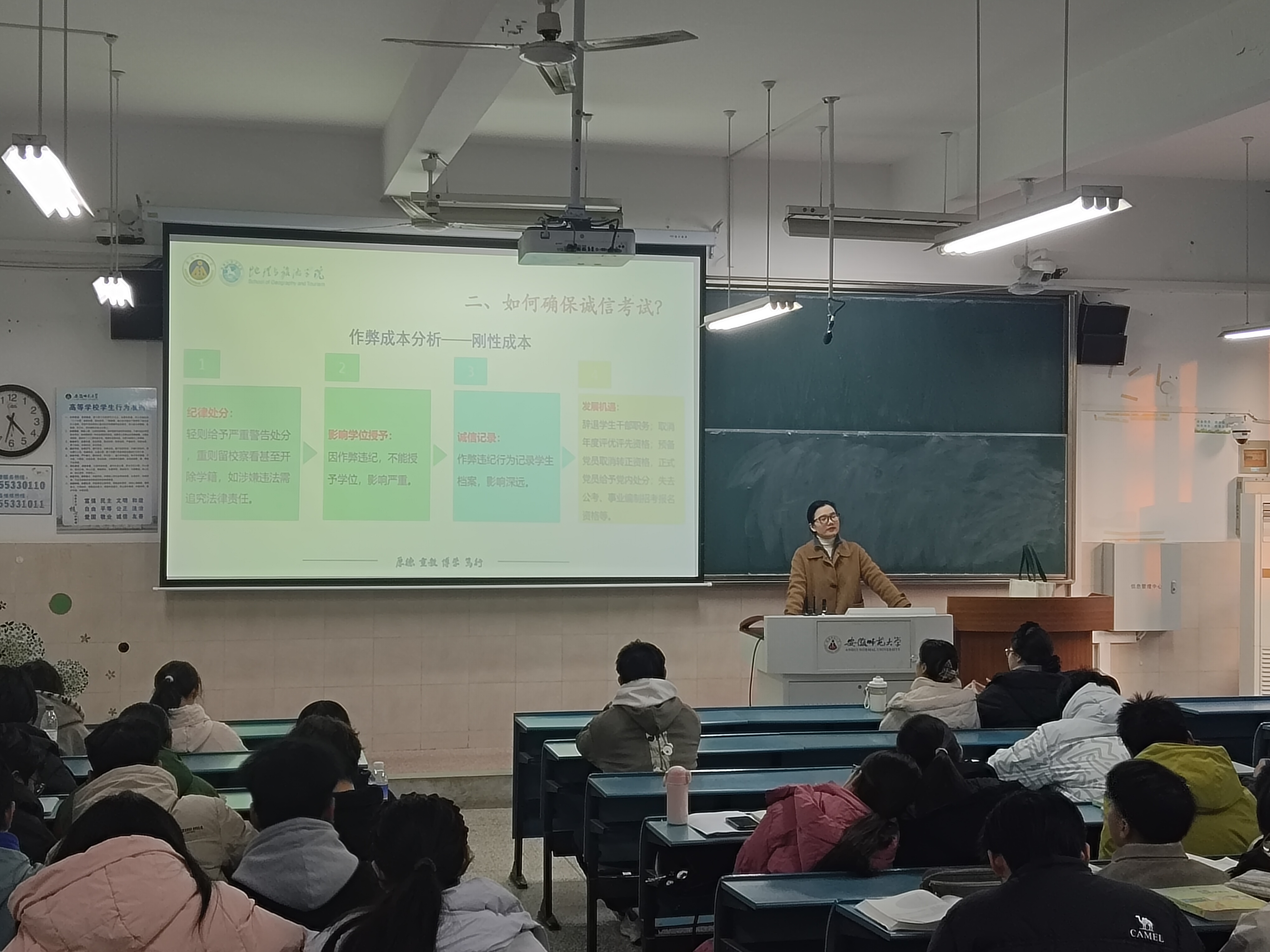 考试纪律及违纪作弊处罚规定》,通过展示考场注意事项,如清理桌肚、备齐双证、严禁携带手机及任何形式的作弊行为等,向全体学生敲响警钟。班会重申,诚信不仅是对学业水平的检验,更是个人品格的试金石,要求大家自觉维护公平公正的考试环境,以真实水平争取优异成绩。
