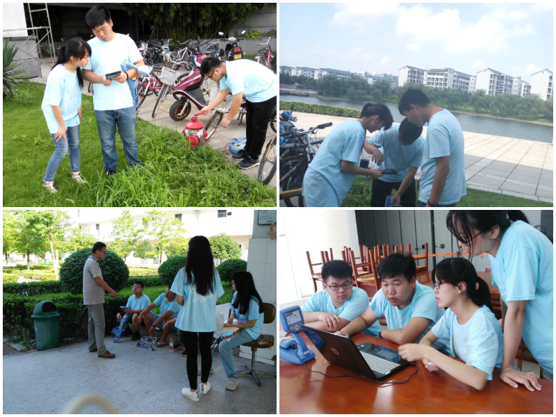 7月8日上午,团队来到了实践地——赭山校区。依据前期的实地考察,与校内专业人员的沟通交流,队员对赭山校区有了一定的了解,因此团队高效率的完成了对校区教学楼附近管网的大体勘测,并实时记录仪器上显示的参数,结合精确的GPS定位仪记录坐标位置。