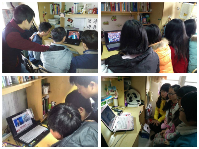 2013级土地资源管理、2013级地理科学专业的同学围坐在电脑前,收看李克强总理在第十二届全国人大三次会议上作政府工作报告现场直播。