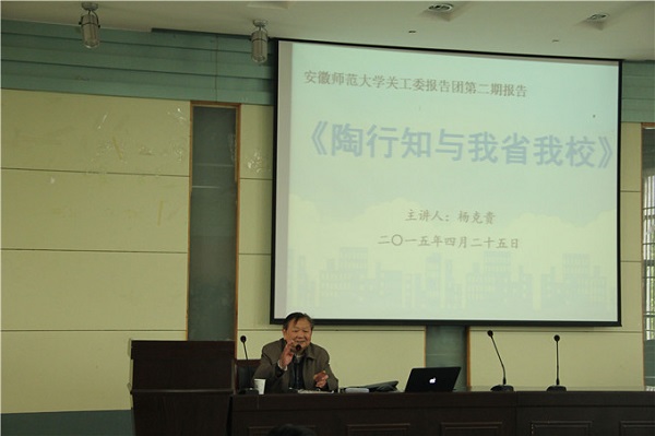 伴随着热烈的掌声,年逾花甲的杨克贵老师走上主讲台。杨老师引用了毛主席为陶先生的一句题词—伟大的人民教育家开场,详细的介绍了陶行知先生的童年、成长、求学、求知等人生重要阶段。重点介绍了陶行知先生在创办学校、启发民智、宣传先进教育理论等方面为近现代中国教育事业所做出的突出贡献。接下来,谈及陶行知与我校的渊源时,杨老师饱含深情地说到:“我校的前身是省立安徽大学,而陶行知先生正是省立安徽大学的创办人之一。在先生离开省立安大后,仍然关心学校的发展,为完善学校各项政策、提高办学水平建言献策。”最后,杨老师慷慨激昂的向同学们呼吁:学习陶行知先生“不为名,不为利”的服务精神;学习他教人求真的育人理念,谨记“千教万教教人求真、千学万学学做真人。”