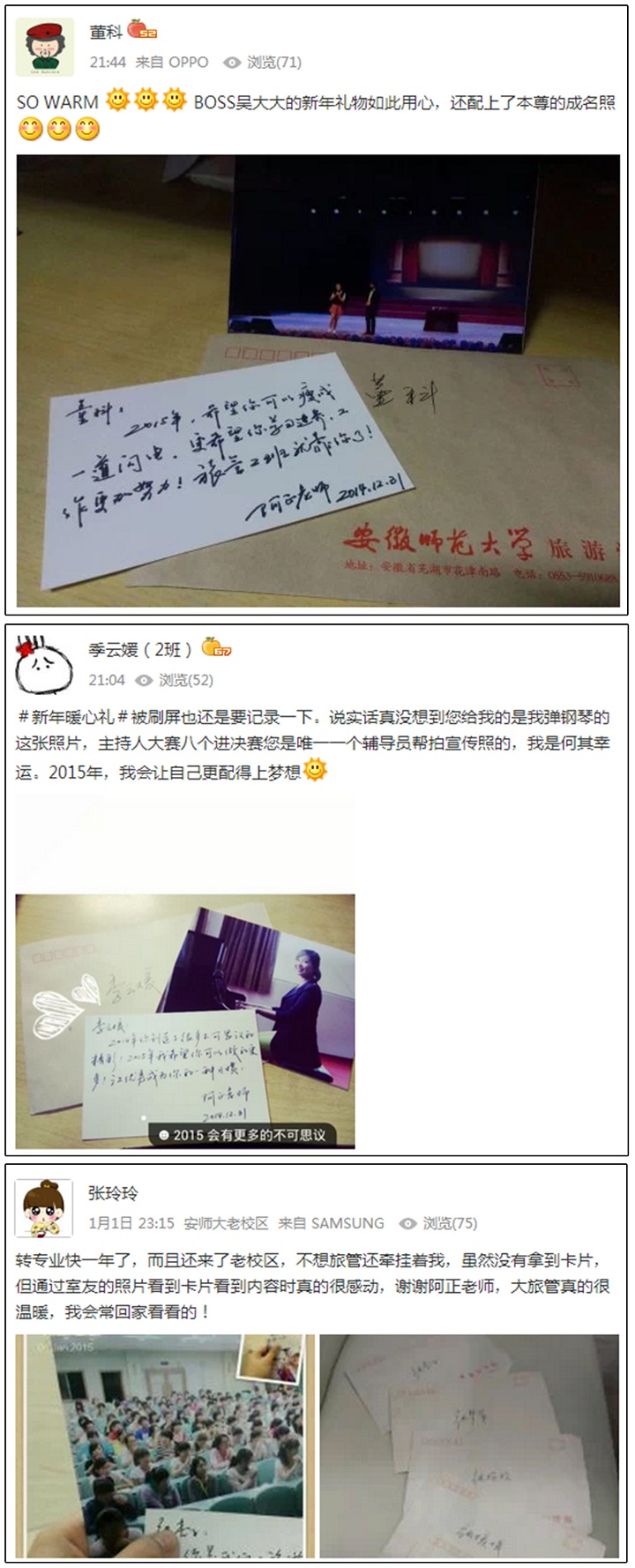 同学们纷纷用“非常感动”、“意外惊喜”、“特别用心”等词汇表达了自己收到礼物的心情,通过短信、QQ和微博等形式向辅导员表达了感谢之情。班长董科同学在自己的QQ空间里写道:“SO WARM!BOSS吴大哥的新年礼物如此用心,还配上了本尊的成名照!”校第二届“师大好声音”主持人大赛获奖者季云媛同学说:“说实话真没想到您给我的是我弹钢琴的这张照片,主持人大赛八个进决赛您是唯一一个辅导员帮拍宣传照的,我是何其幸运,2015年,我会让自己更配得上梦想!”已转至化材学院的张玲玲同学说:“转专业快一年了,而且还来了老校区,不想旅管还牵挂着我,通过室友的照片看到卡片、看到内容时真的很感动,谢谢老师,大旅管真的很温暖,我会常回家看看的!”