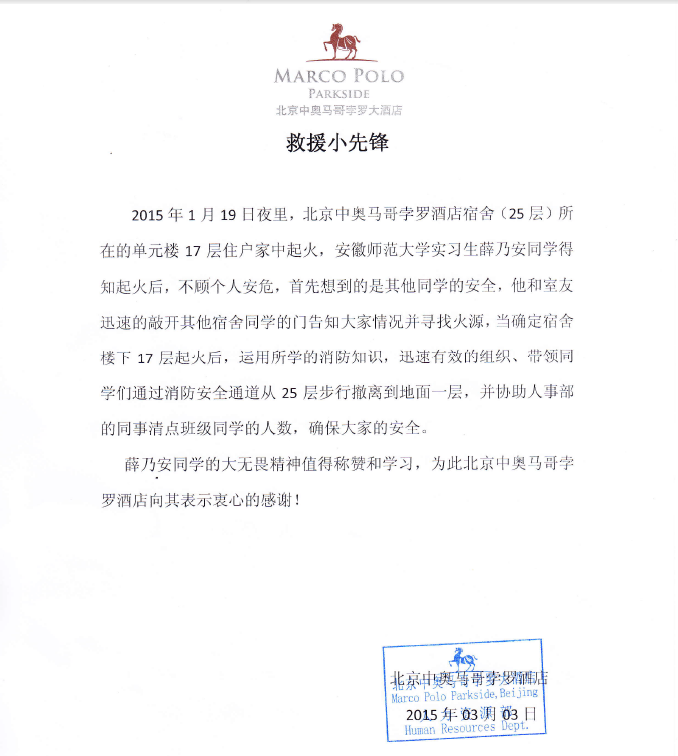 今年1月19日凌晨,我校旅游管理专业实习基地——北京马可孛罗大酒店实习生宿舍楼第17层突发大面积火情。当时正在值班的礼宾部实习生薛乃安同学,第一时间报告酒店相关部门及火警单位,并用电话紧急通知实习导师及实习同学。当获知仍有部分同学未能及时疏散至安全场所时,薛乃安同学焦急万分,奋不顾身地奔进了火灾现场救援受灾同学及同事;但后因火情严重,到达7层时被消防人员劝阻,他只得暂时退离火场,在宿舍楼下配合火警疏散受灾人群。当火势被控制之后,薛乃安同学再次义无反顾地重赴火场,连续数次从大楼1层步行至25层,依次唤醒不同房间中沉睡的同学和员工,直至宿舍楼区员工全部安全疏散为止。