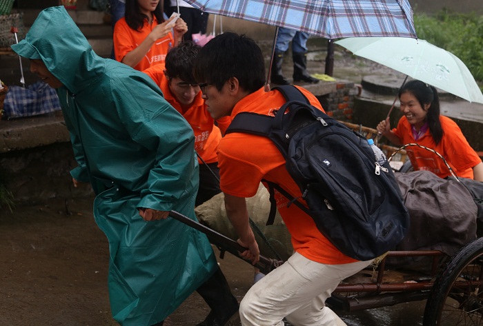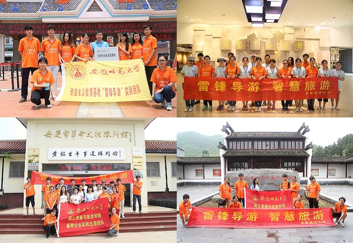 7月7日,为纪念全民族抗战77周年暨“7·7事变”纪念日,“雷锋导游”梦一队赶赴宣城泾县云岭镇的新四军军部旧址,为游客提供义务导游服务,协助景区进行登记工作,对景区游客开展调研走访。“雷锋导游”梦二队则前往铜陵凤凰山,在首次党代会纪念馆和凤凰山景区为游客进行义务讲解。此外,实践团队还前往大通镇淡水豚养殖基地,呼吁大家保护环境关注江豚。值得一提的是,团队在行程秉承了“雷锋精神”,在暴雨中帮助了菜农运输农产品。8日晚,于观湖广场与安师大赴开元酒店间隔旅行团队一起进行了旅游法和旅游知识的宣讲,简洁生动的展板吸引了不少人驻足细读。