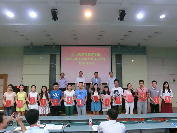在院实验楼101教室召开了2013-2014学年专业实习表彰暨动员大会。大会由学院党委副书记罗振主持,院党委书记吴春雷、院长焦华富、副院长卢松,以及专业指导教师、辅导员老师,11级优秀实习生代表和12级全体即将实习的同学参加了此次动员大会。