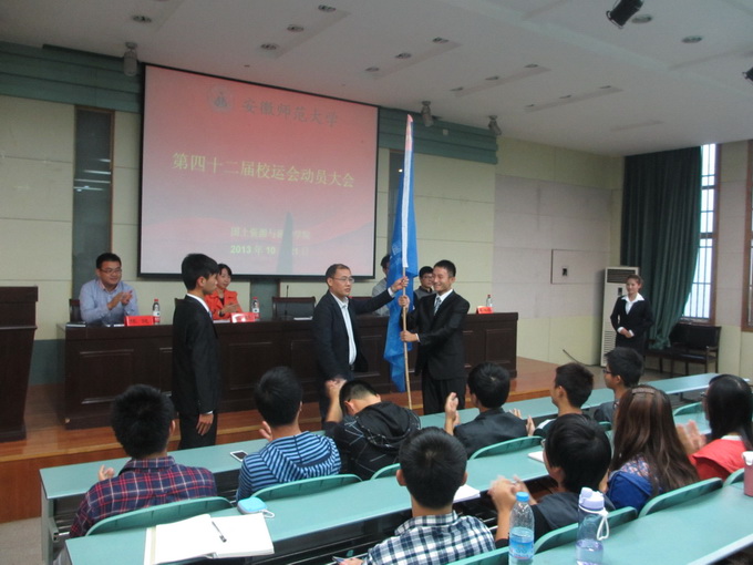 会议在激情洋溢的团歌奏唱中正式开始,12级辅导员张玥和13级辅导员吴辉分别宣布了此次校运会的运动员名单和绿色志愿者名单。运动员代表王立和绿色志愿者代表也分别发表了信心十足和精神饱满的讲话,简洁明了的发言展现了国旅学院全体运动员积极向上,努力进取,友谊第一,比赛第二的精神。会议现场还举行了授旗仪式,院党委副书记罗振亲自将代表国旅学院的旗帜交到了运动员张天然同学的手中。伴随着激昂的乐声,旗帜在讲席的前方舞动,台下响起了热烈长久的掌声。