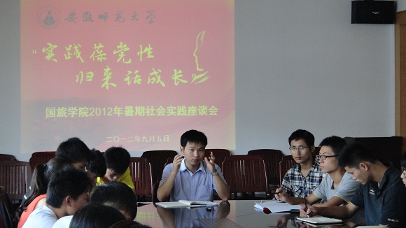 实践葆党性,归来话成长。95,国旅学院2012年暑期社会实践专题座谈会在院行政楼三楼会议室举行。本次会议由院团委副书记张鑫主持,学院2012年暑期社会实践校级、院级、班级团队近60名负责人全员参与。