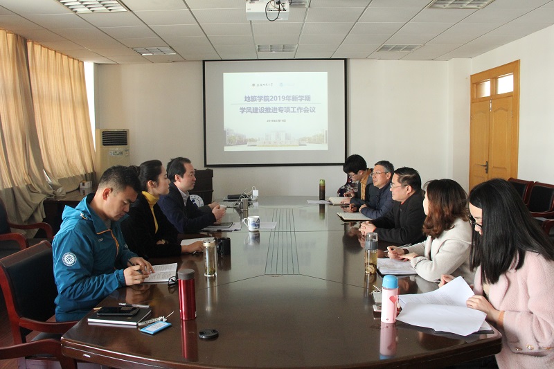 2019年新学期学风建设推进专项工作会议在院行政楼四楼会议室召开,院党委书记贾冠忠、院长苏勤、院党委副书记乔静及全体辅导员参与此次会议。