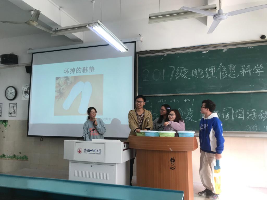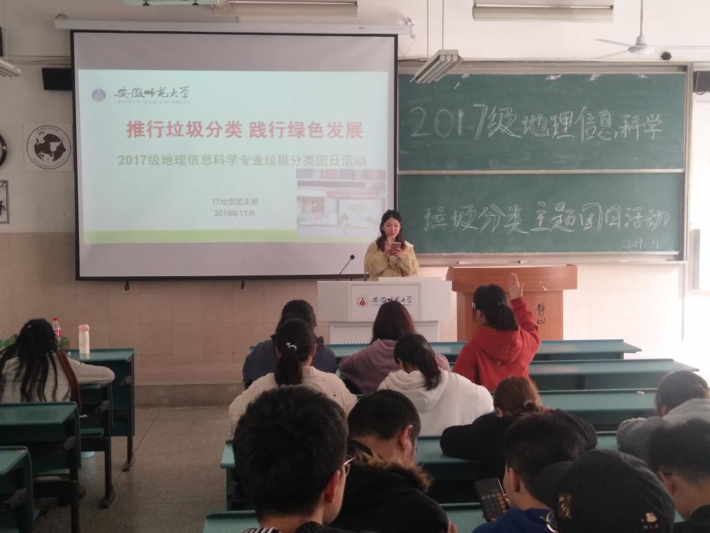 章莹莹)为了推行垃圾分类,提高同学们的环保意识,2017级地理信息科学专业于11月21日下午14点在行知楼2040201组织召开了“推行垃圾分类,践行绿色发展”的垃圾分类主题团日活动。会议由团支书谢煜欣主持,该班级全体同学参与。
