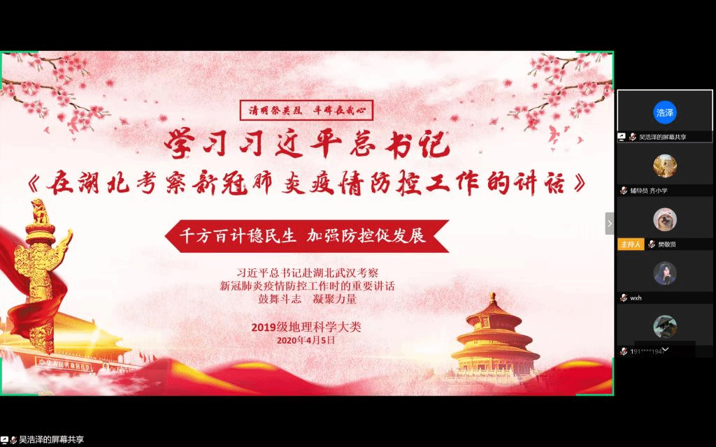 武诺 齐小学)为纪念抗疫牺牲烈士和逝世同胞,学习和发扬伟大抗疫精神。4月5日晚,2019级地理科学大类利用腾讯会议网络平台举行了“清明祭英烈、丰碑在我心”网上主题团日活动。2019级地理科学大类专业辅导员齐小学应邀出席活动。2019级地理科学(拔尖人才班)、地理科学类1班和地理科学类2班全体学生参加活动。活动由2019级地理科学(拔尖人才班)班长樊敬贤主持。