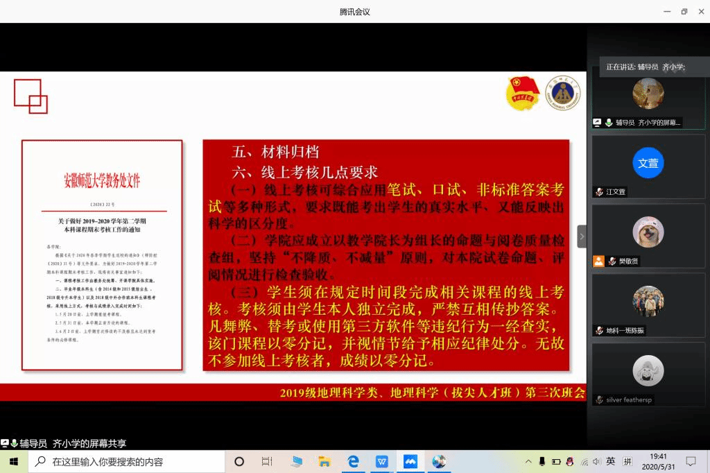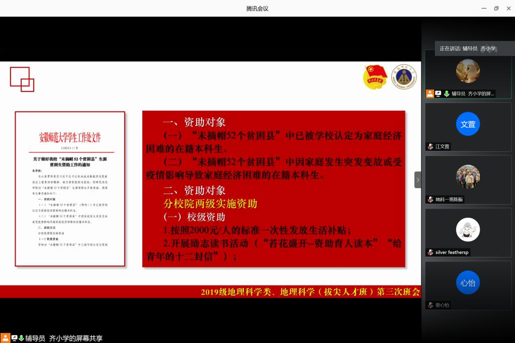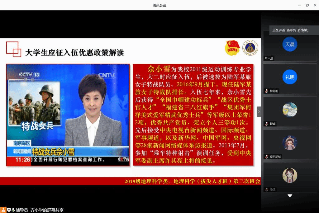 江文萱 齐小学)5月31日晚,2019级地理科学大类积极利用腾讯会议网络平台,顺利举行本学期第三次班会暨大学生应征入伍动员会。2019级地理科学类、地理科学(拔尖人才班)全体同学参加会议,会议由辅导员齐小学主持。