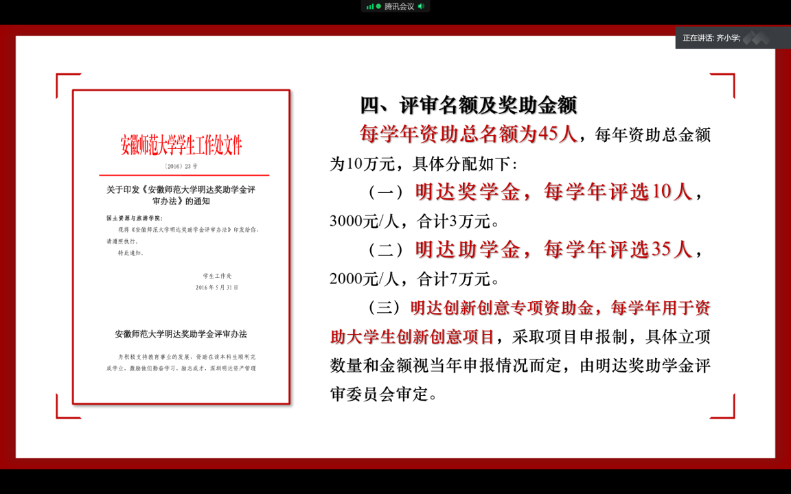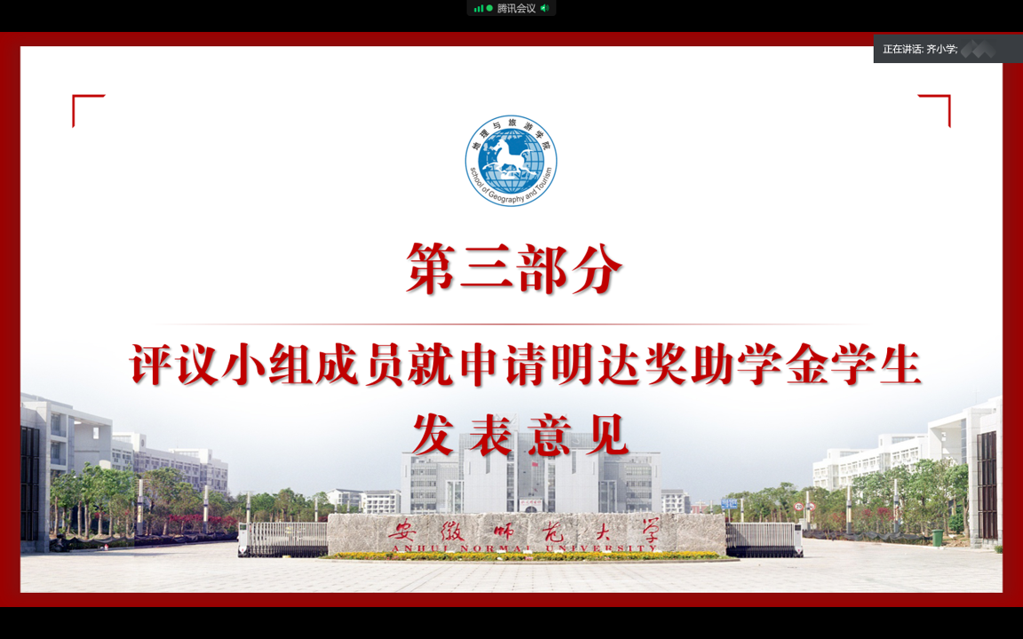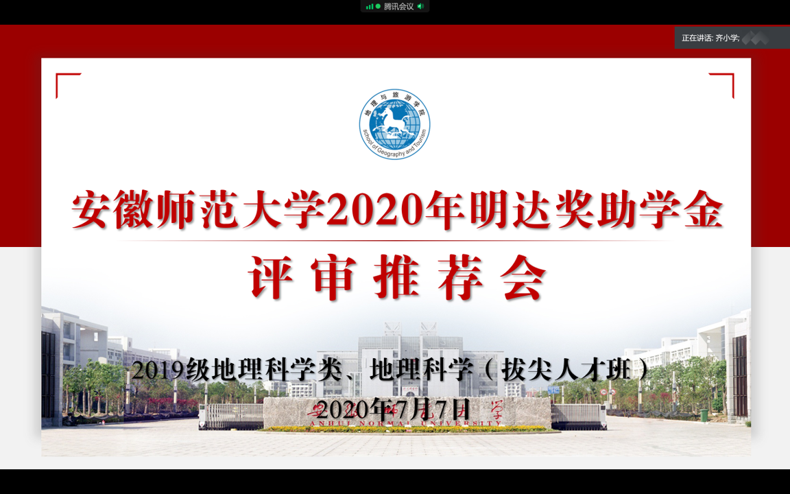 齐小学)7月7日晚,2019级地理科学类1班、2班和2019级地理科学(拔尖人才班)利用腾讯会议网络平台,顺利召开明达奖助学金评审推荐会,各班级评议小组全体成员参加会议。会议由评议小组组长、辅导员齐小学主持。