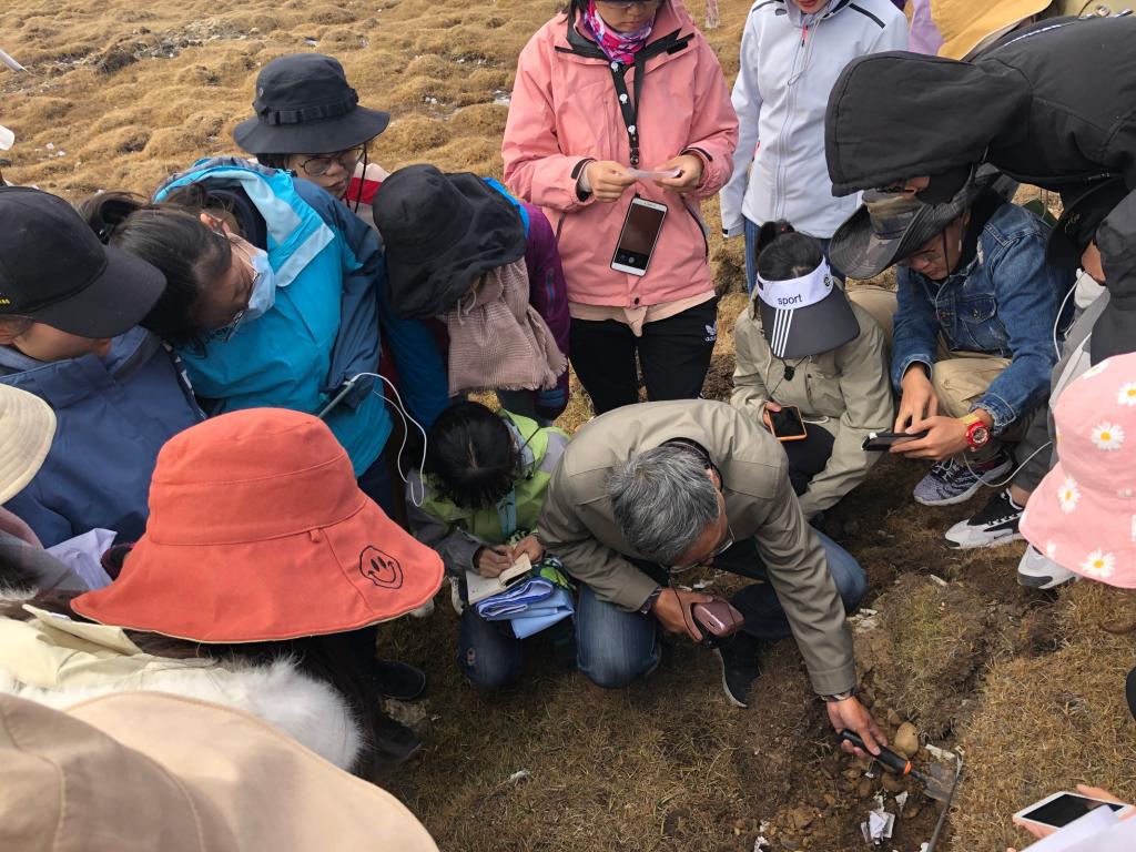 接着团队坐车来到了羊肠子沟和景阳岭垭口,羊肠子沟的喀斯特地貌是地质野外实习的延伸,杨立辉老师向同学们说明道,石灰岩经过化学溶蚀等作用会形成碳酸钙,地上部分溶蚀为石芽,地下部分有溶洞,发育钟乳石,石柱等。在景阳岭垭口,老师再次讲解了土壤的分层结构,并希望通过野外的考察,能使同学们将书本知识与地理实际景观相对应。在海拔3700多米的高原,大家依然不减学习的热情,积极拿着实习记录本并利用手机认真记下老师的授课内容。