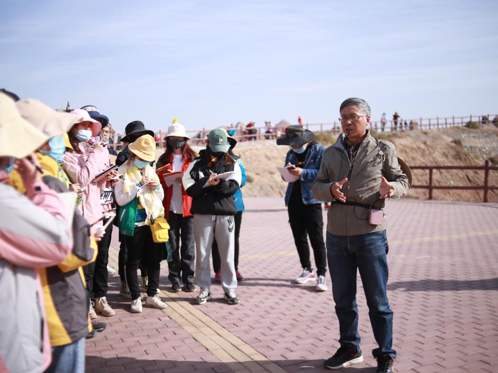 第五个地点考察完成后,同学们又经历了两个多小时的车程来到了今天的第二个实习考察点——张掖的七彩丹霞。程先富先讲解了丹霞地貌形成的地质过程和影响其颜色的因素。程先富接着又给大家介绍了丹霞山的地貌特点——顶平、崖峭、麓缓,为了让同学们更好地理解,程先富十分形象的将其比作为一顶帽子。