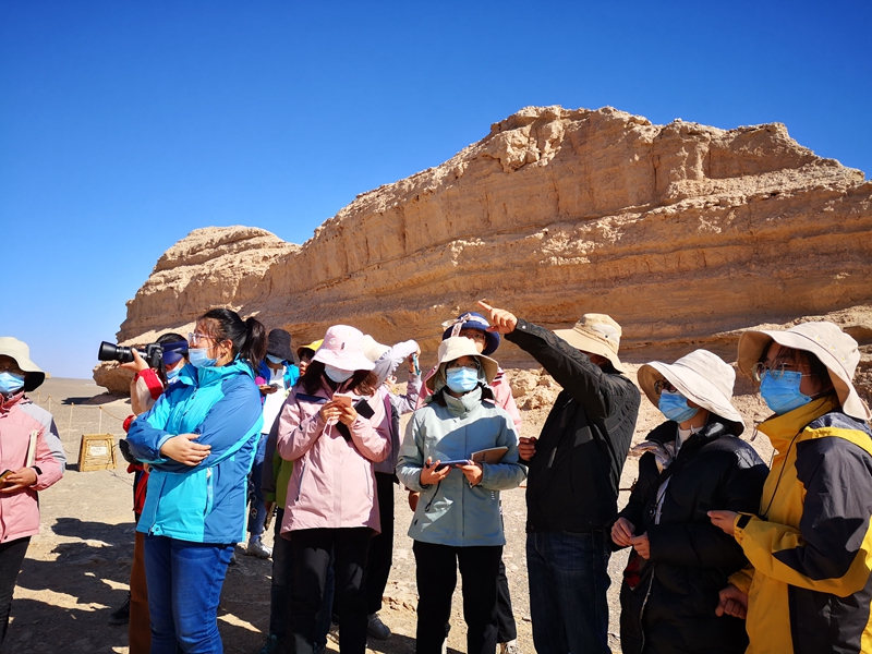 羌笛何须怨杨柳,春风不度玉门关。正如程先富在车程中解说道,玉门关又称小方盘城,曾是汉代时期重要的军事关隘和丝路交通要道。10月14日上午9时,在顺利抵达目的地玉门关后,程先富带领同学们考察古长城建筑所用原料及其与古环境之间的联系。根据程先富的讲解,同学们了解到小方盘城地处祁连山西段,原属于宽阔的古罗布泊,现可观察到青灰色泥岩层和远处的疏勒河,据此能够指示该地的河湖相沉积。