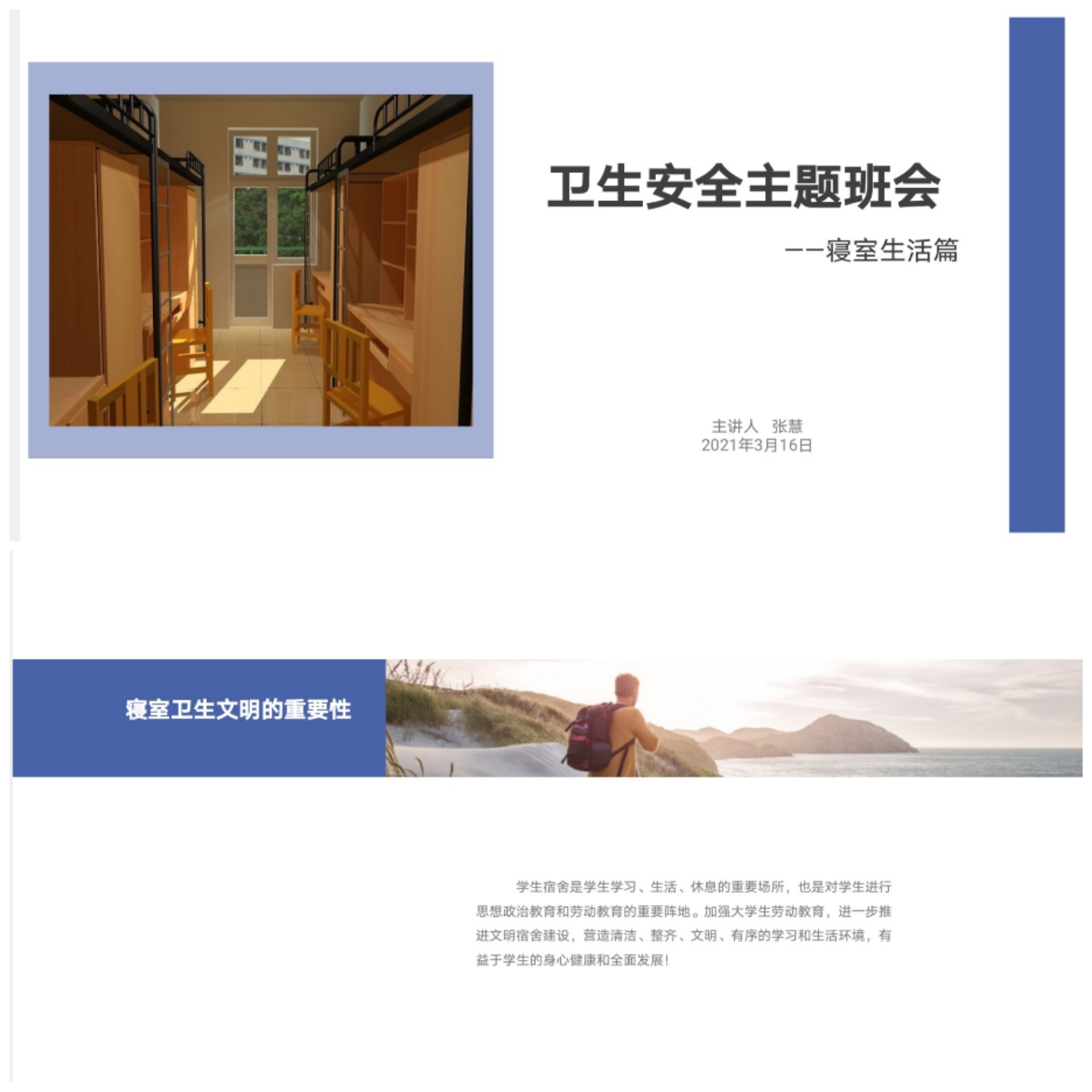 卫生安全主题班会上,张慧就寝室生活与同学们进行了交流。张慧首先详细解读了寝室卫生大检查的要点,包括检查时间、检查内容、检查方式等,督促同学们开展寝室卫生大扫除,并建议寝室长落实轮值制度,将日常寝室卫生打扫分工到位,共同构建和谐健康的寝室环境。张慧还强调了寝室违规用电可能带来的一系列安全隐患,并结合近期事件提醒同学们注意个人财产安全。