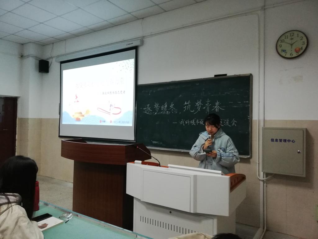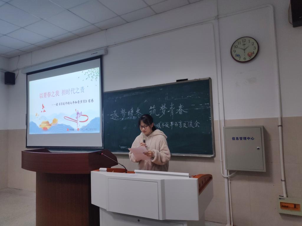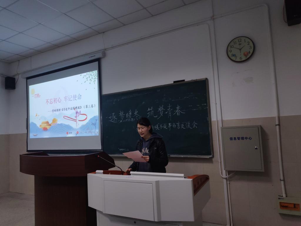 首先,孙浩畅以“以青春之我,担时代之责”为题分享了《习近平的七年知青岁月》读后感,吴净以“不忘初心,牢记使命”为题分享了《习近平谈治国理政》第三卷读后感,号召同学们要在不懈奋斗中创造未来,勇做走在时代前列的奋进者、开拓者、奉献者,努力在实现中国梦的生动实践中放飞自己的青春梦想。随后,凌佳妍、刘威、韩雨彤谈及自己对家乡变化的见证与感触,包括基础设施建设、社会保障、生态环境等方面,展现了近年来国家快速发展带来的人民生活水平的提高。接着,李娜分享了假期在淮北市图书馆任志愿者的实践经历,包括协助图书馆工作人员为读者测温扫码登记、解答读者咨询等工作,号召同学们尽己所能为疫情防护贡献青春力量。韩雨彤总结强调道:“青年学子应当提高素质能力、锻炼实践能力,做时代的建设者和践行者。”