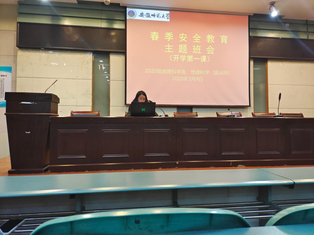 本网讯(周亮、彭媛媛)为提高学生春季安全意识,2020级地理科学类、地理科学(拔尖班)地理科学类、拔尖班于2021年3月9日晚在实验楼101报告厅召开“春季安全教育”主题班会。班会由辅导员彭媛媛主持,2020级地理科学类、地理科学(拔尖班)全体学生参会。