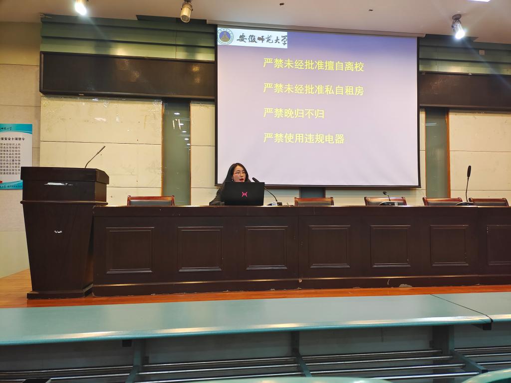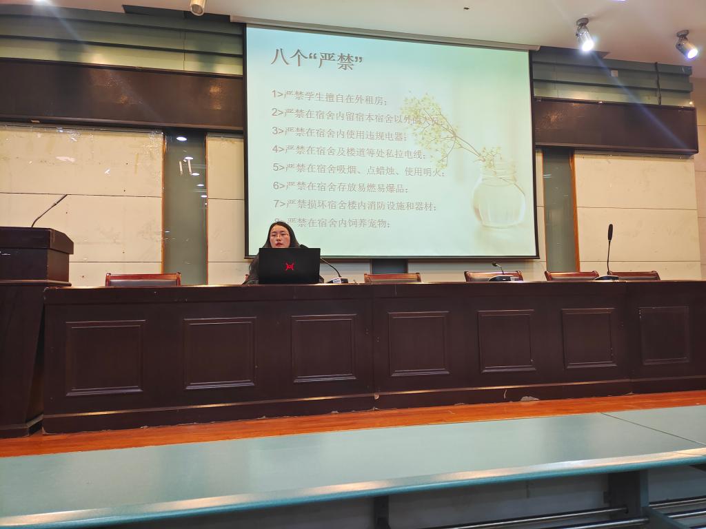 学生手册中的四大禁令:严禁未经批准擅自离校,严禁未经批准私自住房,严禁晚归不归,严禁使用违规电器。此外,彭媛媛强调了宿舍管理八大“禁令”,希望同学们都能注重寝室卫生,和谐相处,互帮互助,争创文明寝室。
