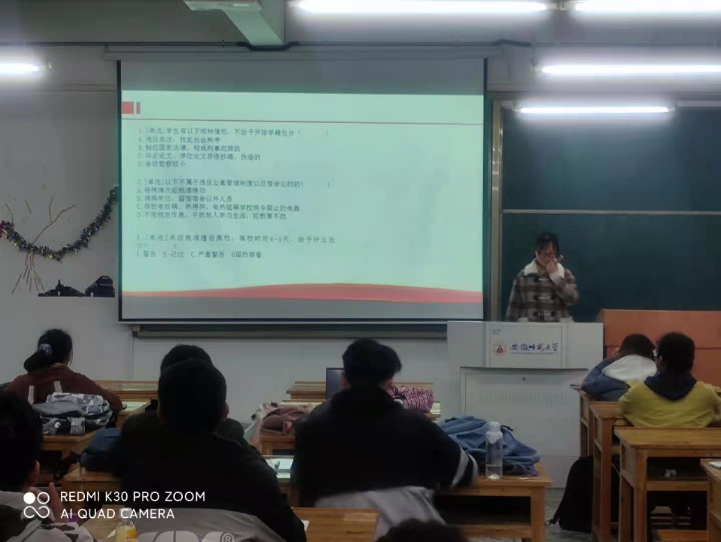 学生管理“四项禁令”:严禁擅自离校、严禁私自租房、严禁晚归不归、严禁违规电器,通过竞答的方式对班级同学进行校规校级知识考核。最后,辅导员刘少杰通过讲述真实案例向大家再次强调认真学习并严格遵守国家法律法规和校规校级的必要性和重要性,并对每位同学提出要求:对于校规校级的学习不仅要内化于心,也要外化于行!