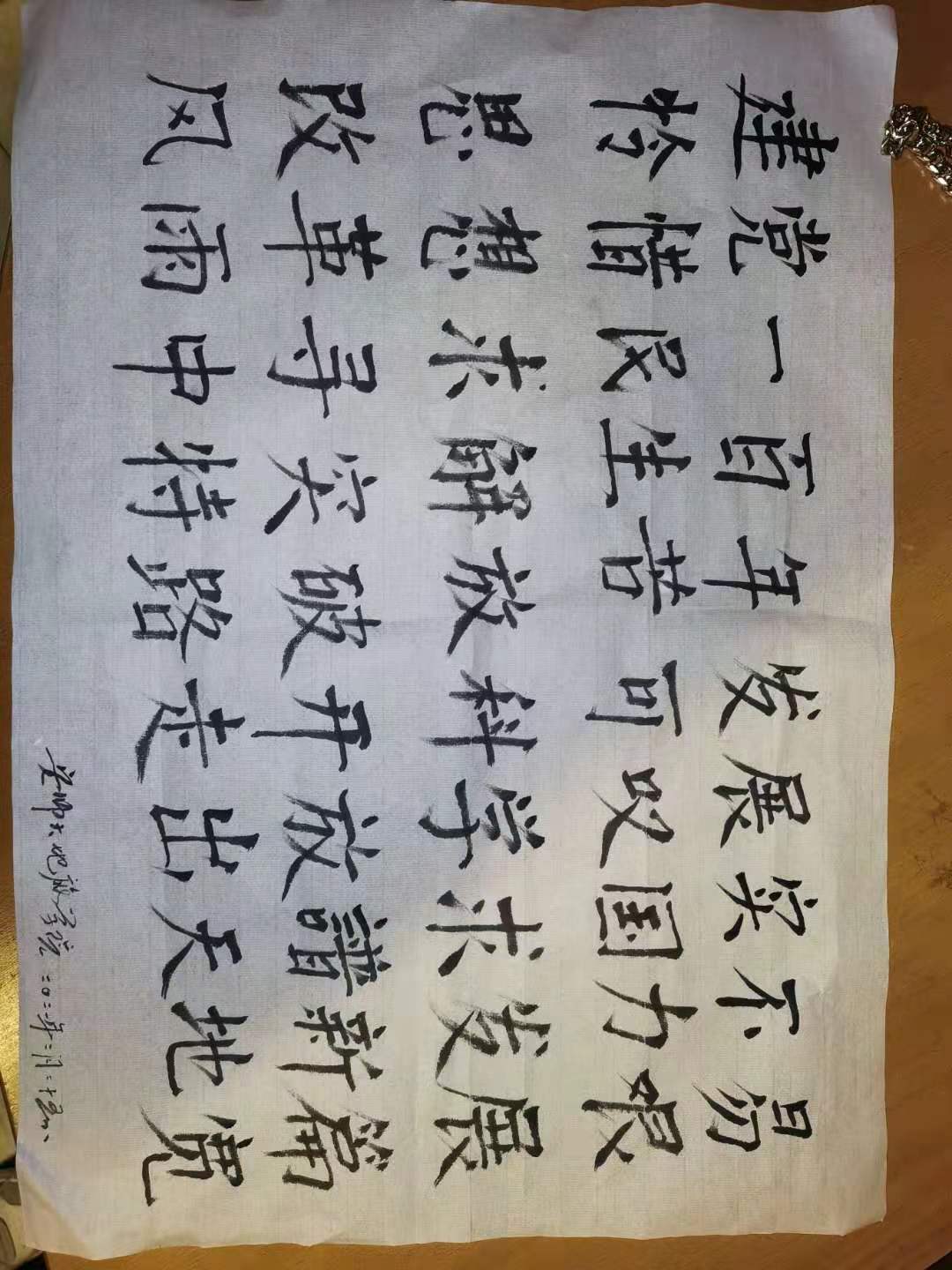 献礼建党100周年:通过线上社会调查及实地探访红色基地等形式,包舒越认真学习贯彻习近平新时代中国特色社会主义思想,积极围绕党的十九大和党的十九届二中、三中、四中、五中全会精神,讲好党的故事,讲好中国故事。林丹倩和杨松宁则以书法的形式为党的100周年真情献礼。