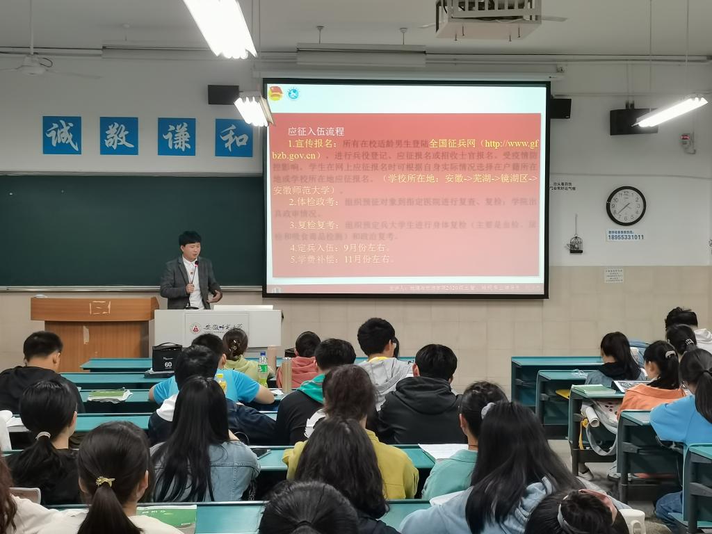 刘少杰 袁明峻 陆峻然)为号召青年学生携笔从戎,参军报国,为实现中国梦、强军梦贡献力量。4月28日晚,2020级土地资源管理和2020级城乡规划专业召开大学生应征入伍宣传教育主题班会。会议由辅导员刘少杰主持,2020级土地资源管理与2020级城乡规划专业的全体同学参加了此次班会。