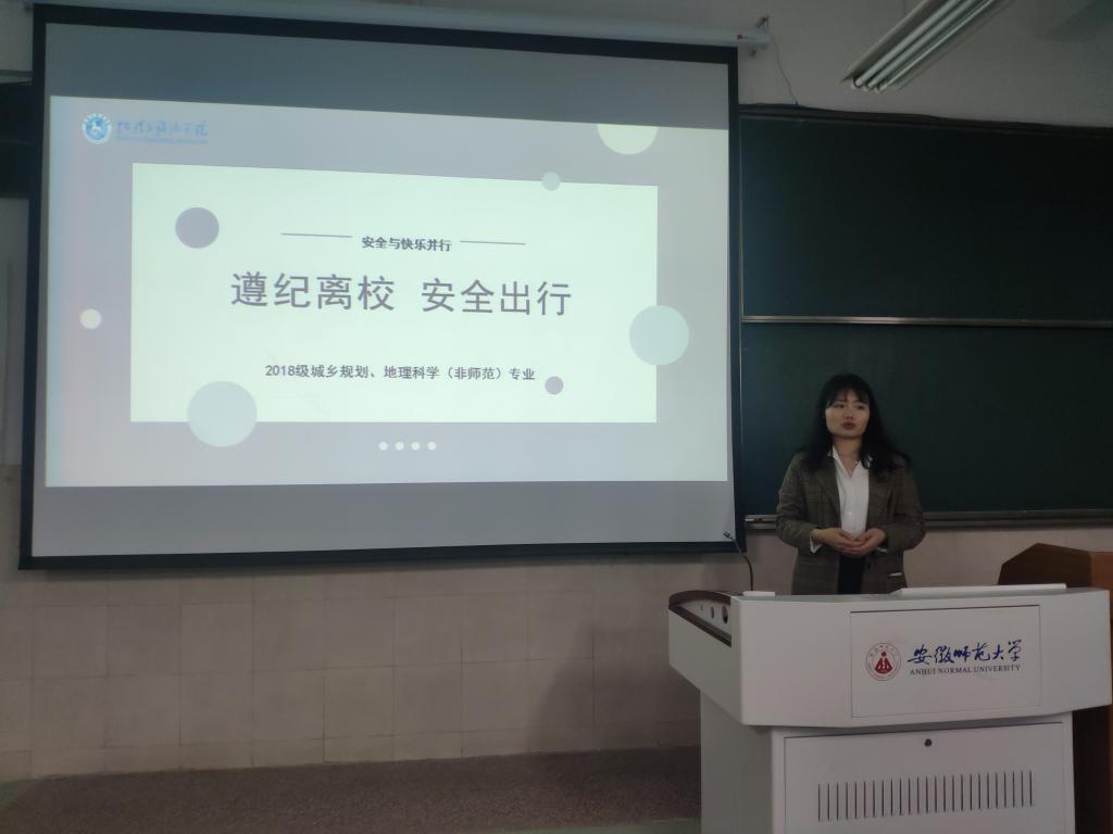 2018级城乡规划专业及2018级地理科学(非师范)专业于行知楼4号楼301开展“遵纪离校 安全出行”主题班会。会议由辅导员张慧主持,2018级城乡规划专业与2018级地理科学(非师范)专业全体同学参与。