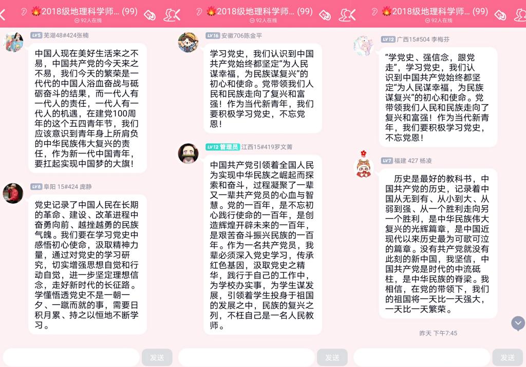何雨婷 丁茹栩)为庆祝中国共产党成立100周年,深入学习贯彻习近平总书记视察清华大学时的重要讲话精神,推动“学党史、强信念、跟党走”学习教育在全校共青团系统持续深化,引导广大团员青年厚植爱党、爱国、爱社会主义情感,5月4日下午7点30分在线上腾讯会议举行2018级地理科学(师范)“学党史 强信念 跟党走”主题班会。此次班会由团支书何雨婷主持,2018级地理科学(师范)专业全体成员参加。