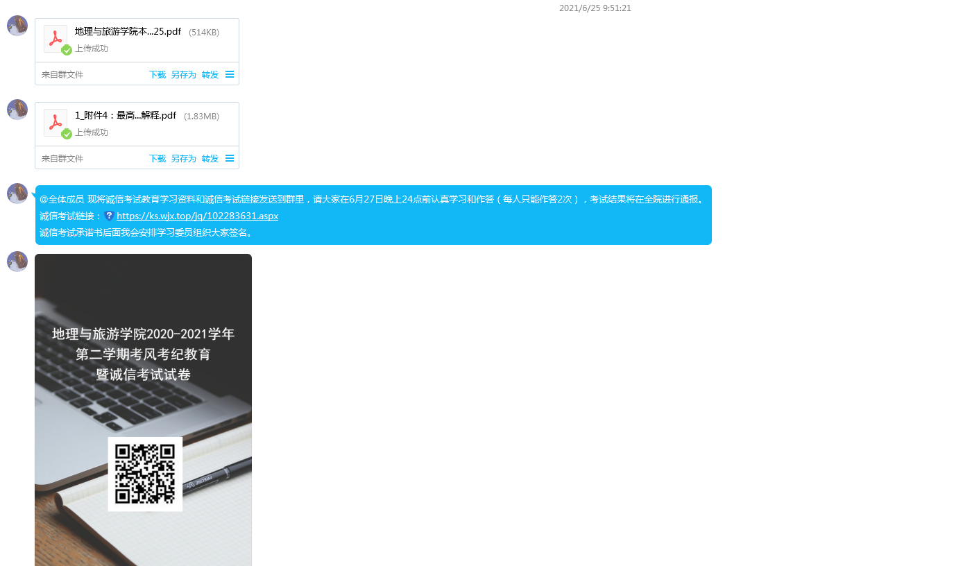 张慧 李娜 潘爽)2021年6月23日晚,2018级地理科学(非师范)专业及2018级城乡规划专业“严于律己 以诚参考”诚信考试主题班会在行知楼4号楼104顺利举行。班会由辅导员张慧主持,2018级地理科学(非师范)专业及2018级城乡规划专业全体同学参加。