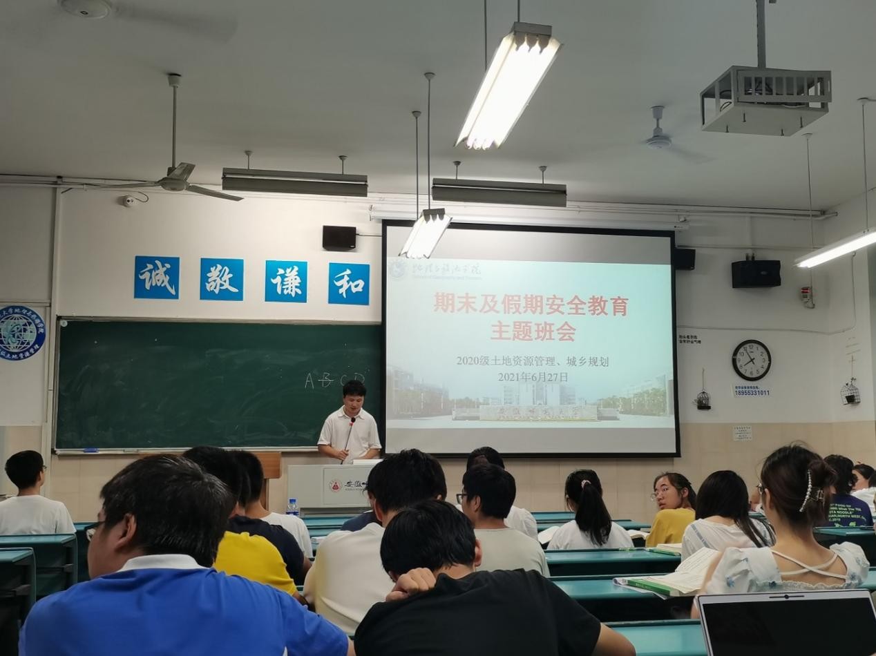 2020级城乡规划、20级土地资源管理于2021年6月27日晚上在行知楼开展期末及假期安全教育主题班会,会议由辅导员刘少杰主持, 2020级城乡规划、20级土地资源管理全体学生参与。