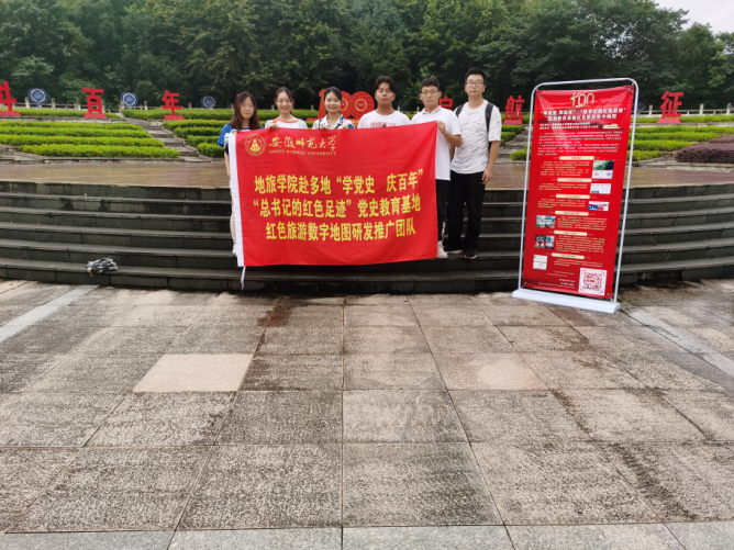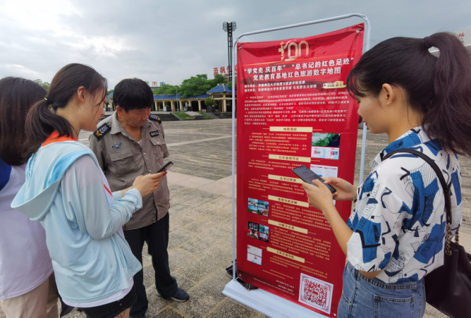立足学科专业特色,充分挖掘红色资源,加强课程思政改革,大力创新形式载体,围绕党的十八大以来习近平总书记走过的“红色足迹”,采用“互联网+地理信息+红色旅游+党史学习”模式,历时两个多月,完成了这样一部集多功能为一体的智慧“云地图”,为中国共产党成立一百周年献礼。红色旅游数字地图展板树立后,引得过往市民纷纷驻足观看。团队成员细致耐心的对市民们提出的问题进行解答,并对其中包含的党史知识和地理知识进行讲解。获得了市民们很高的评价,也很好的对党史知识和地理信息数字地图进行了宣传。通过推广红色旅游数字地图,团队成员更好的学史明理、学史增信、学史崇德、学史力行,讲好党的故事,讲好中国故事,更好地传承红色基因,担当时代责任,同时也展现出了新时代青年大学生的良好风貌。
