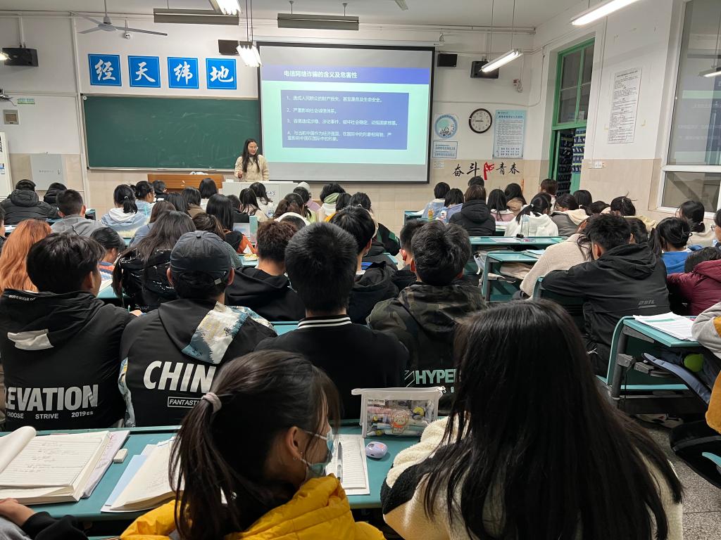 随后,韦银艳借专业的数据分析来给同学们展示网络电信诈骗的深重危害,呼吁大家一定要提高警惕,保护好自己的身份隐私及财产安全,在自己不能确定时应先向长辈及老师询问,不让违法犯罪者有机可乘。各类具体案件也被一一呈现在同学们面前。韦银艳强调,从学生到教授,从青年人到老年人,皆有被诈骗案例。并现场请同学分享自己和家人曾经被电信诈骗但及时破解的经历,告诫同学们不要掉以轻心,不要因贪图利益而落入陷阱。为更有效防范网络电信诈骗,韦银艳将各类案例的应对措施详细地介绍给同学们,呼吁大家牢记“十个凡是,三个不,两个建议,一个核实”。