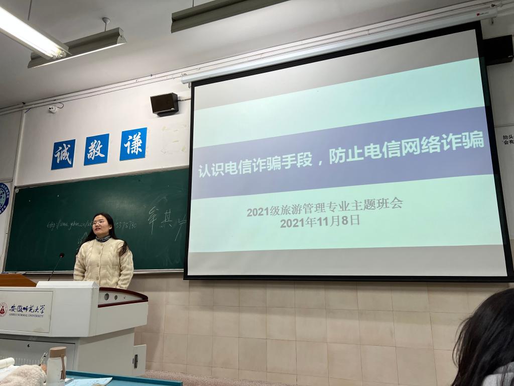)为加强当代大学生的网络安全意识、识别网络诈骗能力,有效防止网络诈骗,11月8日,21级城乡规划、旅游管理专业辅导员韦银艳组织两专业分别开展防止电信网络诈骗主题班会。