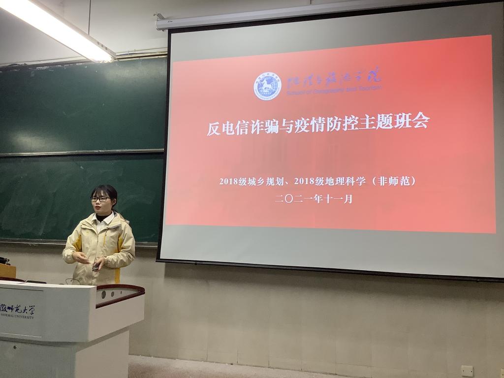 本文讯(张慧 潘爽)为加强学生防范意识、普及反诈知识,2021年11月8日晚,2018级地理科学(非师范)专业及2018级城乡规划专业在行知楼3号楼103教室召开“反电信诈骗和疫情防控”主题班会。会议由辅导员张慧主持,2018级地理科学(非师范)专业及2018级城乡规划专业全体同学参加。