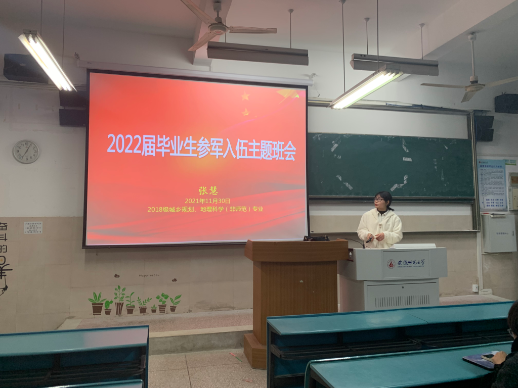 本网讯(文/张慧 图/潘爽)为全面贯彻落实习近平强军思想,切实做好2022年春季大学生应征入伍宣传工作,增进同学们对征兵入伍政策的了解,从而提高兵员征集的数量与质量。11月30日晚7点,2018级城乡规划及地理科学(非师范)专业在行知楼4号楼103教室召开2022届毕业生参军入伍主题班会。会议由辅导员张慧主持,2018级城乡规划及地理科学(非师范)专业全体同学参与会议。