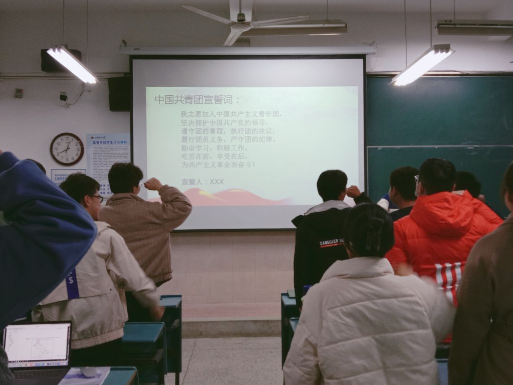 本次大会共有七项议程。第一项议程,唱团歌。音乐响起,同学们齐声高唱团歌,一张张严肃的脸庞彰显着同学们的认真与重视。第二项议程,杨周洲汇报团支部2021年党史学习成果并结合团支部工作与个人实际交流心得体会。第三项议程,团支部委员、团小组组长结合学习生活实际和自身日常行为表现进行交流发言。第四项议程,杨周洲汇报支部开展教育评议工作情况,并对团员进行等级评议,通过班级的选举投票,杨周洲最终公布了11位优秀团员名单。第五项议程,各团小组组长汇报对团支部委员会工作的意见建议。第六项议程,各团小组对支委会进行满意度测评,并对团支部建设提供了切实可行的建议。第七项议程,入团誓词。全体团员肃然起敬,举起右拳一起光荣宣誓,许下承诺。