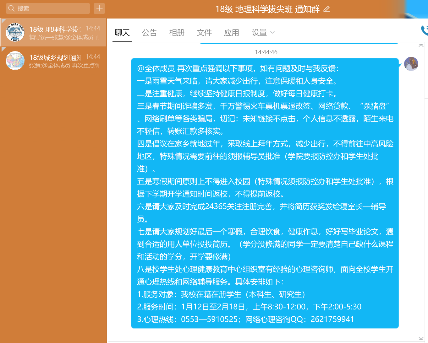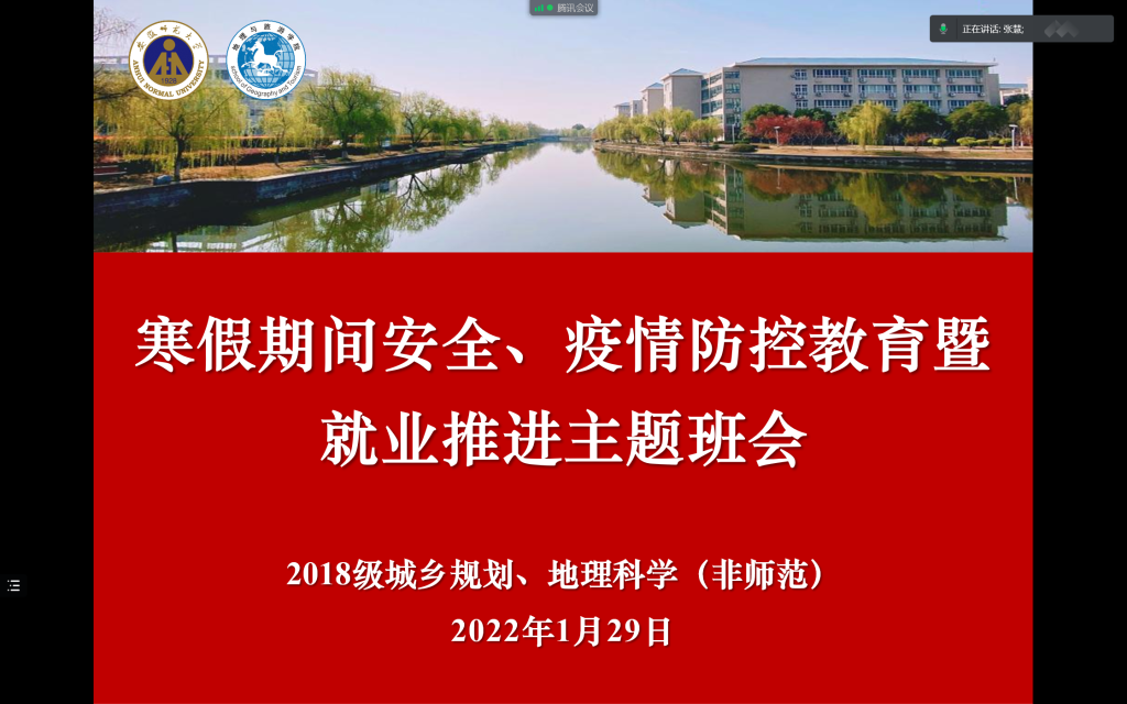 (本网讯 张慧)为做好寒假安全教育,引导学生健康文明生活,1月29日下午2点,2018级城乡规划及地理科学(非师范)专业在腾讯会议召开寒假期间安全、疫情防控暨就业推进主题班会。会议由辅导员张慧主持,2018级城乡规划及地理科学(非师范)专业全体同学参加。