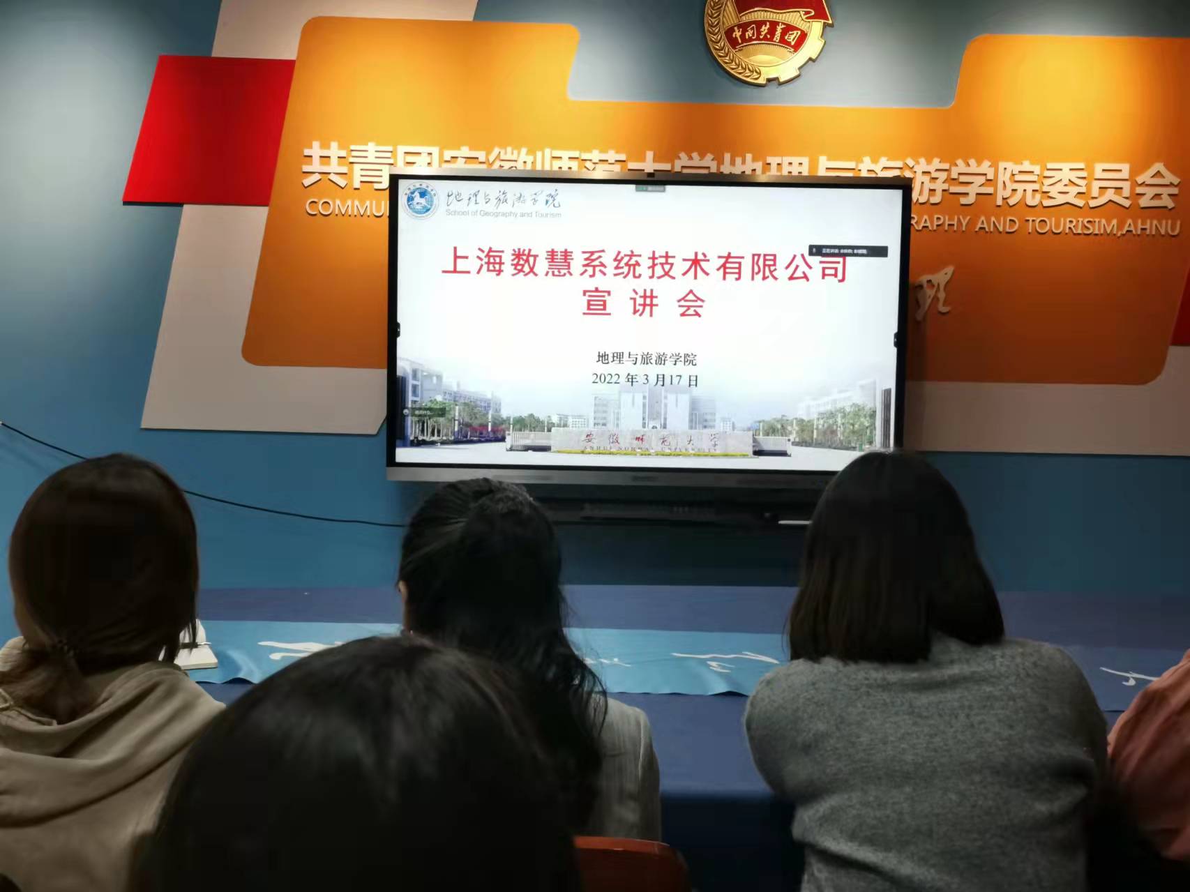 的实习合作单位之一,希望同学们认真聆听,抓住机遇。随后,上海数慧徐经理向同学们阐述了“聚焦生态文明,聚焦技术赋能,聚焦专业服务”的公司理念,介绍了公司职业发展培养途径、招聘岗位等等,随后还向同学们展示了公司的福利待遇以及薪资等问题,全方位、详细地向同学们介绍了公司的信息。最后,同学们踊跃与企业HR进行深入沟通,主动了解用人单位的情况,交流会现场气氛活跃。