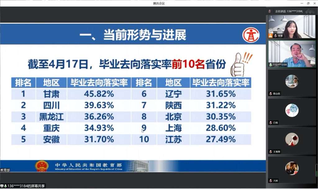 随后,乔静、韩会然及城乡规划专业老师开展就业帮扶情况线上交流。韩会然、王雪微、李俊峰等老师详细介绍了自己所帮扶学生的目前状况与存在问题,并围绕重点工作安排明确了下一步举措。乔静表示,就业是常态化工作,是衡量人才培养质量的重要标准,就业工作要贯穿大学四年,从专业思想教育、职业生涯教育、专业素质培养等方面入手,全方位提升毕业生就业创业能力。
